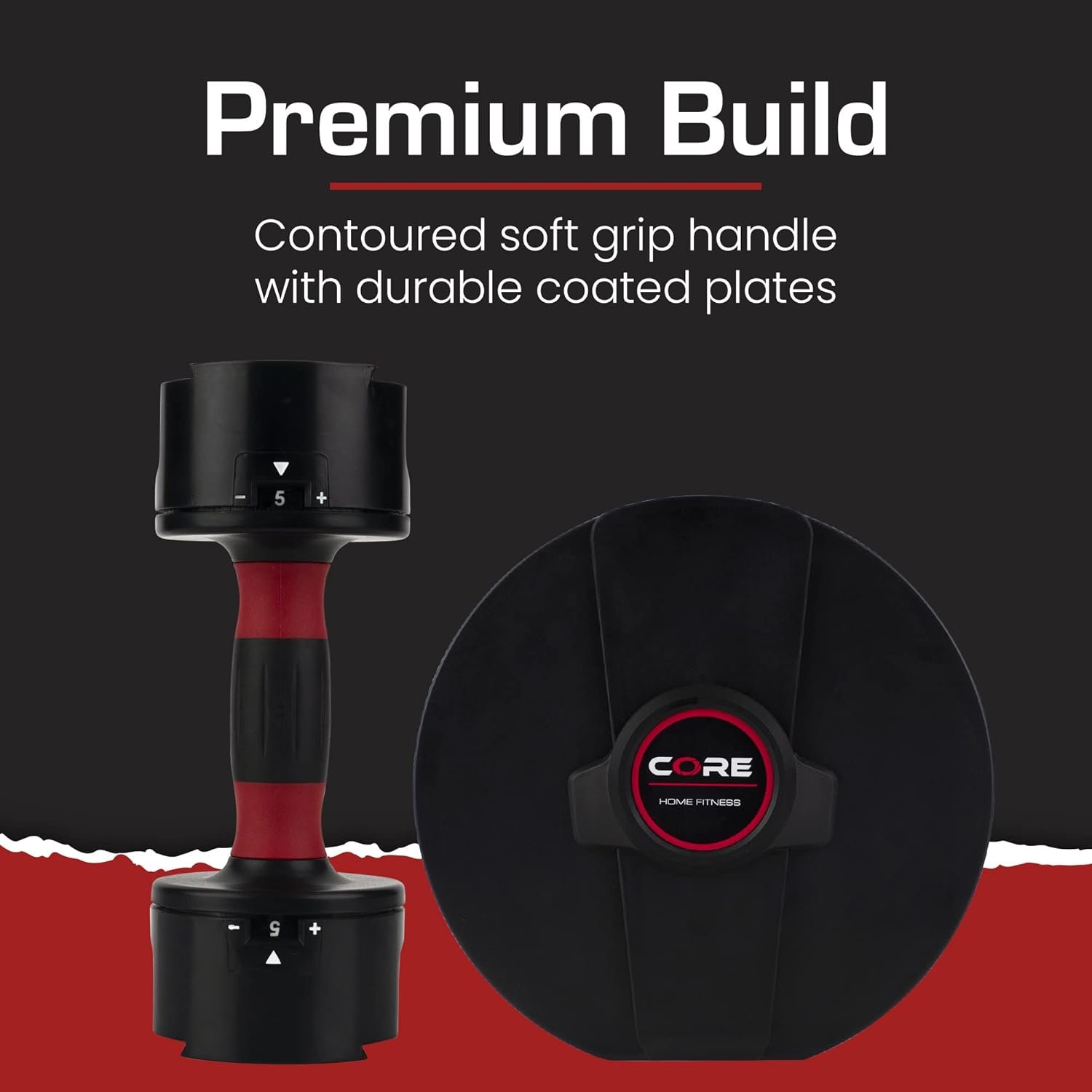 Get powerful home workouts with a fraction of the space — the Core Fitness Adjustable Dumbbell Weight Set replaces up to 10 pairs of traditional dumbbells in one sleek, compact pair. Effortlessly switch between weights with a quick‑turn handle and enjoy the comfort of a contoured grip and durable construction designed for daily strength training sessions — all without cluttering your home gym.