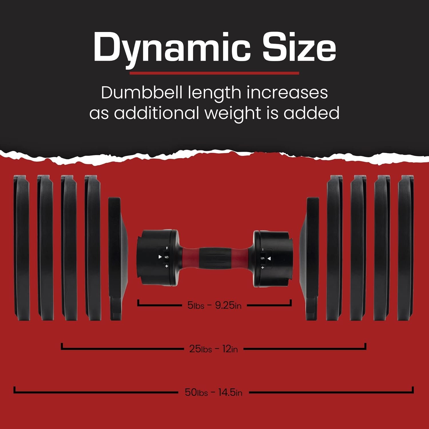 - Wide Weight Range: Each dumbbell adjusts from 5 lbs up to 50 lbs in 5‑pound increments, supporting a full range of strength training exercises.