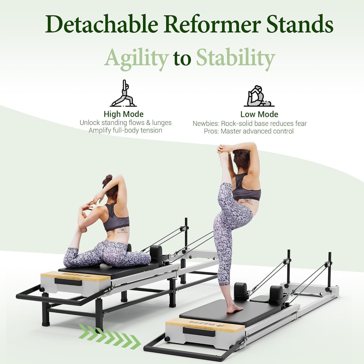 - Adjustable Reformer Heights: Easily switch between low and high settings for stability or challenge.